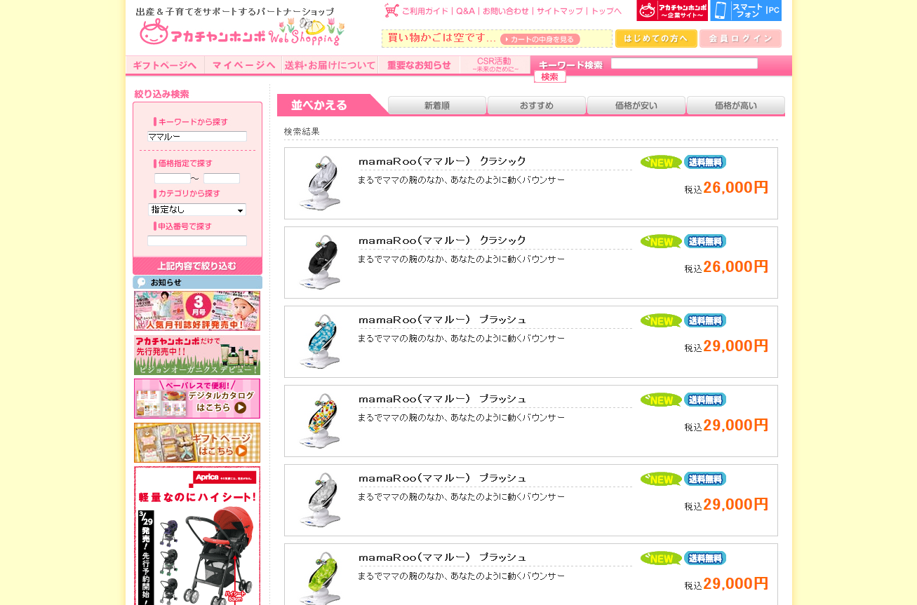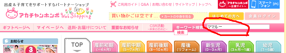 赤ちゃん本舗のサイトでどうやってママルーを探すかと言いますと